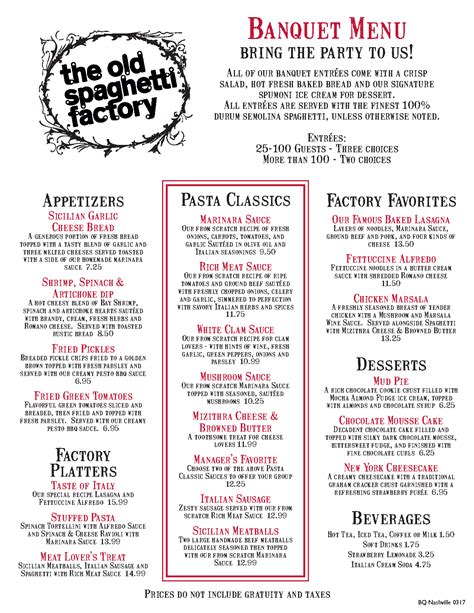 The Old Spaghetti Factory Menu Prices. The old spaghetti factory menu > the old spaghetti factory nutrition >. Web on the the old spaghetti factory catering menu, the most expensive item is chicken parmigiana, which costs $59.99.